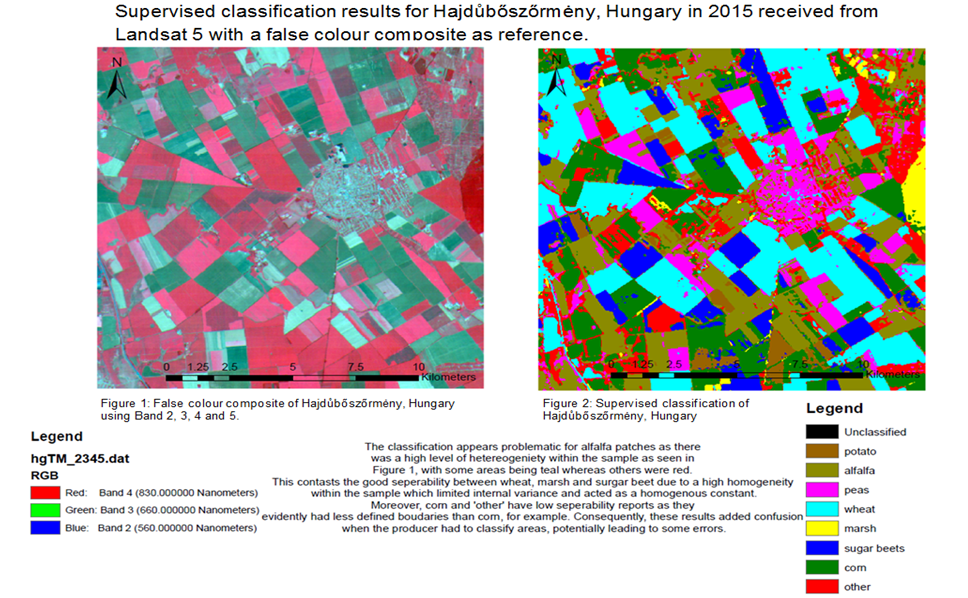 Out of supervised and unsupervised, I preferred supervised classification. Supervised classification, as defined by Al-doski et al. (2013), is where the user identifies the training site to classify the pixel through its spectral signature. I found it rewarding and enjoyable to create different training sets and to see the map outcome. It enlightened me to the internal variability of different vegetation, such as my alfalfa data and the necessary steps to remedy this including combining classes.